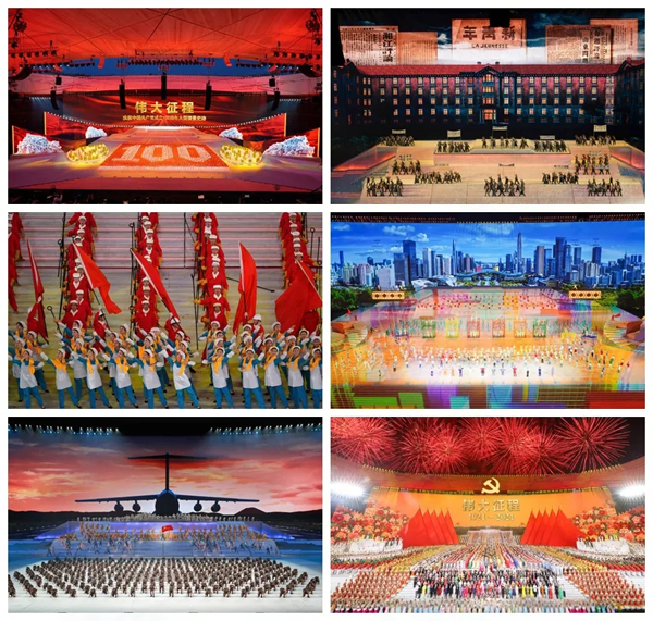 庆祝中国共产党成立100周年文艺演出《伟大征程》围绕百年来中国共产党带领中国人民进行革命、建设、改革,到今天走进新时代、迈向全面建设社会主义现代化国家的新征程这一主线展开,将党的百年辉煌历程浓缩在了两个小时的艺术表达中。演出分为“浴火前行”“风雨无阻”“激流勇进”“锦绣前程”四个篇章,其创作与筹备历时近两年,来自全国各地的70余家单位的近8000名演员参与。