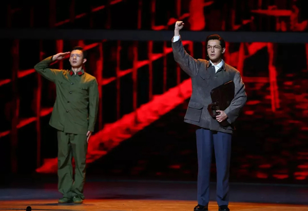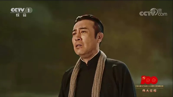我参与演出的是整台晚会的第一个节目——《破晓》,可想其对整台晚会的意义。当舞台一转出,便是我饰演的陈独秀正在哭泣,面对满目疮痍的旧中国,他既为之悲痛却又无比坚定,这种复杂的情感需要即刻被调出来。“南陈北李”相约建党的内容观众虽已熟知,但能否用饱满的情绪与丰沛的感情将陈独秀当时的决心与复杂的心理活动准确而富有感染力地呈现,这成为演出成败的关键。说实话,原本我是有些担心的,担心自己无法恰如其分地即时释放这种情感,担心自己感染力不够,但当我转身看到现场情绪高昂的观众,感受到鸟巢里升腾的激情氛围,那一刻,我就是陈独秀,我,始终在角色里。