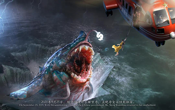 《归舟》生动地描绘了孟晚舟的“脱险”过程:挣脱的电子脚镣、伸出援手的中国救援直升机、张着大嘴的星条旗恶鲨……图片下方配有小字“经中国政府不懈努力,孟晚舟女士回到祖国”,表达对孟晚舟归国的热烈欢迎。