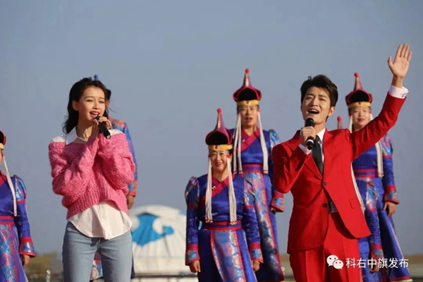 “我们的中国梦”——文化进万家中宣部、中国文联文艺志愿服务队走进内蒙古科右中旗主场慰问演出现场。图为孙怡、尹颂演唱《我们都是追梦人》(图片来源:科右中旗发布)