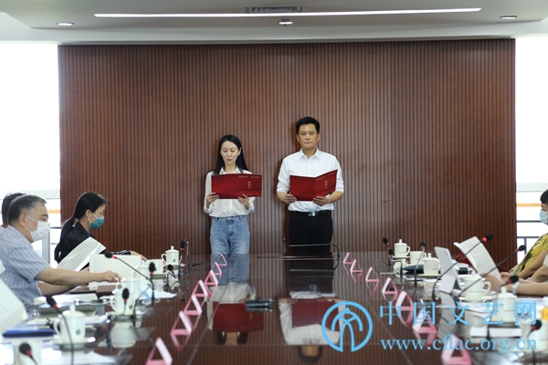 8月25日,中国剧协“加强戏剧界行风建设 弘扬德艺双馨精神”座谈会在京召开。图为王斑、王乐君宣读中国文联8月24日发布的《修身守正 立心铸魂——致广大文艺工作者倡议书》。
