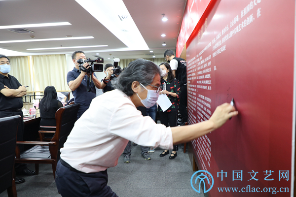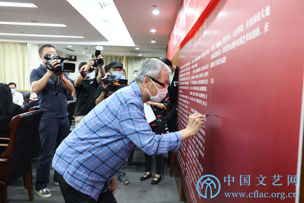 8月26日,中国书协在北京召开“修身守正 立心铸魂——中国书协职业道德和行风建设工作座谈会”。图为与会书法家代表在《修身守正 立心铸魂——致广大文艺工作者倡议书》上签名。中国文艺网 李想 摄