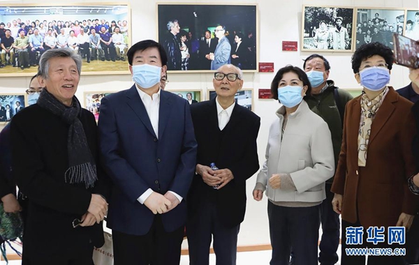 1月5日,田华(左三)、邵大箴(右二)和傅庚辰(左二)等在第四届中国文联知名老艺术家艺术成就展上合影。 新华社发(梁琴摄)
