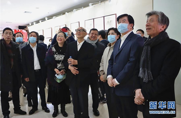 1月5日,嘉宾参观在北京中国文艺家之家展览馆举行的第四届中国文联知名老艺术家艺术成就展。 新华社发(梁琴摄)