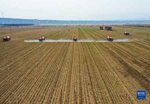 2月22日,高地隙植保机在山西省运城市芮城县新村作业(无人机照片)。新华社记者 柴婷 摄