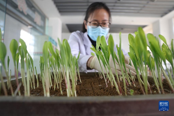 在辽宁东亚种业有限公司种子质量检测中心,工作人员查看玉米种子发芽实验结果(2020年3月16日摄)。新华社记者 杨青 摄