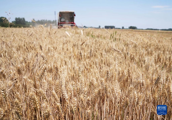 河北省衡水市阜城县崔家庙镇前砖门村农民在麦田收获小麦(2021年6月13日摄)。新华社记者 朱旭东 摄