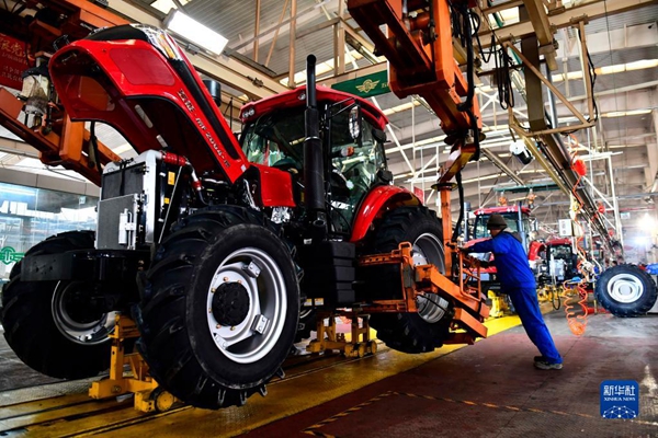 2月15日,在山东五征集团山拖农业装备有限公司,工人在生产线上装配农用拖拉机。新华社记者 郭绪雷 摄