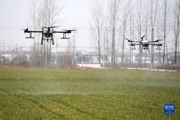 2月11日,无人机在安徽省亳州市谯城区赵桥乡“无人农场”喷洒除草剂。新华社记者 刘军喜 摄