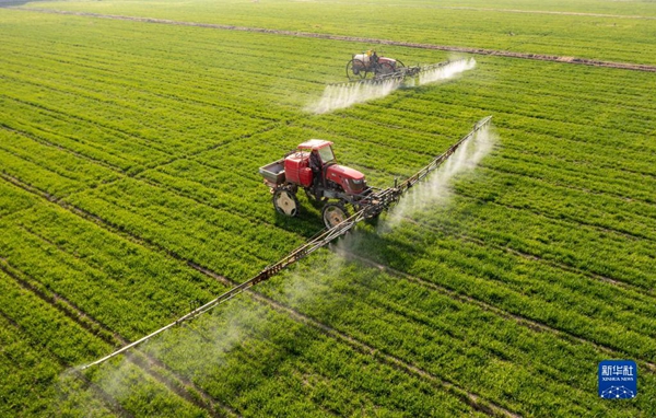 2022年3月9日,在江苏省海安市大公镇贲集村,村民驾驶植保机械在小麦田间进行喷洒药物作业(无人机照片)。 新华社发(翟慧勇 摄)
