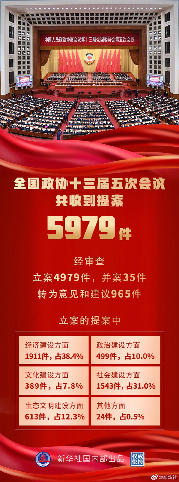 全国政协十三届五次会议共收到提案5979件。经审查,立案4979件,并案35件,转为意见和建议965件。立案的提案中:经济建设方面提案1911件,占38.4%;政治建设方面提案499件,占10.0%;文化建设方面提案389件,占7.8%;社会建设方面提案1543件,占31.0%;生态文明建设方面提案613件,占12.3%;其他方面提案24件,占0.5%。