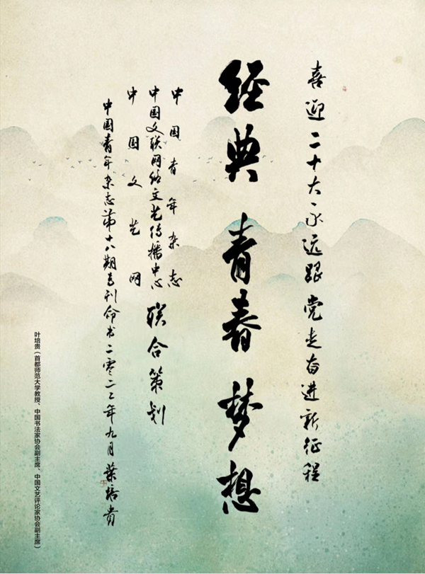 在新中国成立73周年、全党全国各族人民翘首期盼党的二十大胜利召开之际,共青团中央机关刊《中国青年》杂志2022年第18期《经典 青春 梦想》专刊正式出版。共青团中央书记处第一书记贺军科,中国文联党组书记、副主席李屹分别撰写了卷首语,梁晓声、徐则臣、胡智峰、何沐阳、郐振明、伊泓远、黄晓明等来自文学、影视、戏剧、音乐、舞蹈、美术、摄影、杂技、民间文艺等重要文艺领域的名家名人、专家学者和青年文艺工作者畅谈了参与经典创作、推动文艺发展、引领青年成长的深刻感悟。中国书法家协会副主席叶培贵为专刊创作了主题书法作品。
