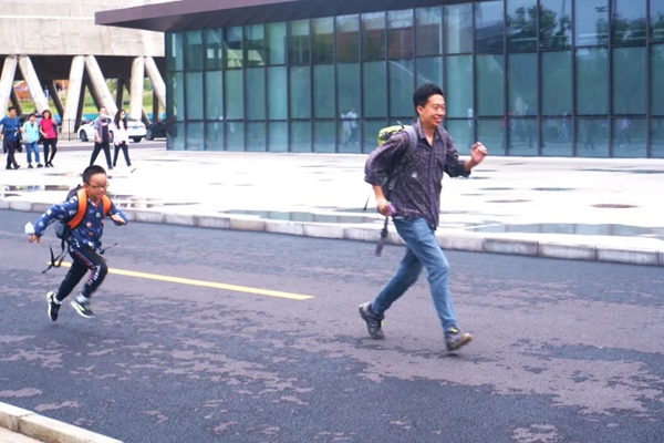 “等我长大,一定会追上你!”——在园区内赛跑的父子俩。