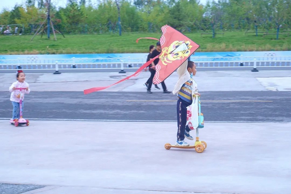 “妹妹快跟上!风筝要飞起来了!”——手拿风筝,在滑板车上疾驰的少年。