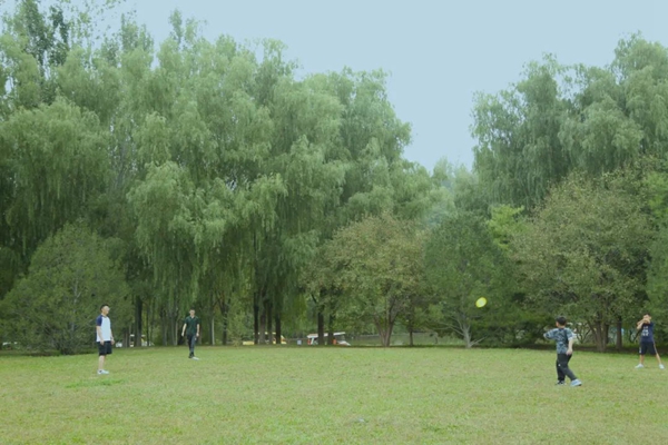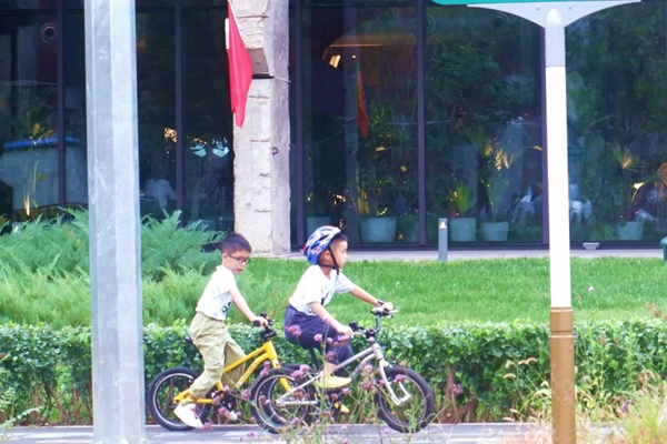 “骑上我最爱的小自行车,它永远都不会堵车~”——在红旗下追逐的两位骑行少年。