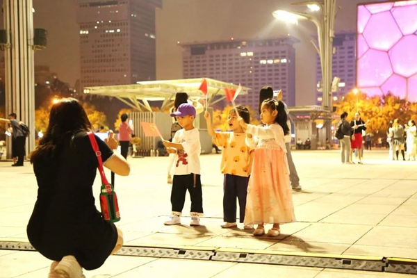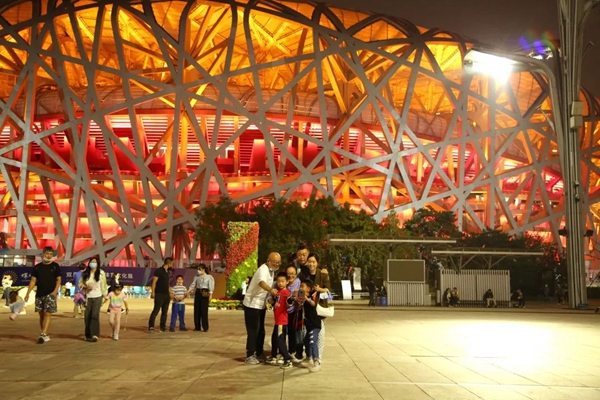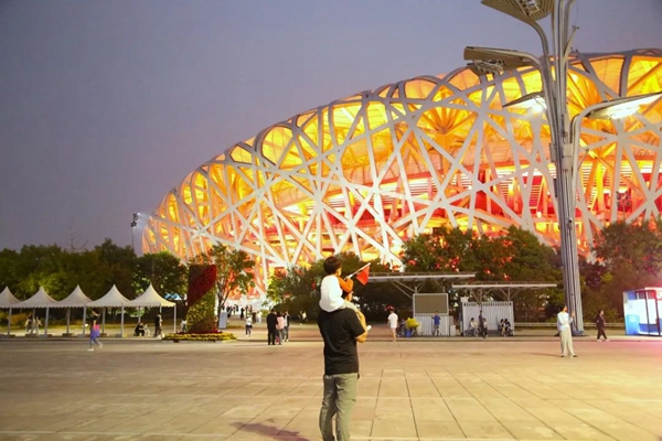 “我将来会在里面参加比赛吗?”——小朋友骑在爸爸的肩上,手挥国旗,注视灯光璀璨的鸟巢。
