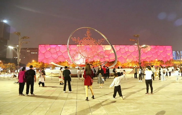 水立方灯光闪烁,游人们在北京2022冬残奥会火炬台前合影留念。