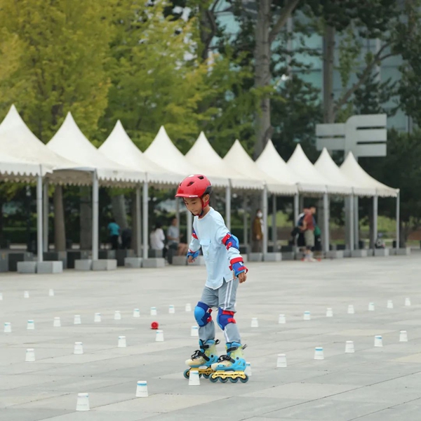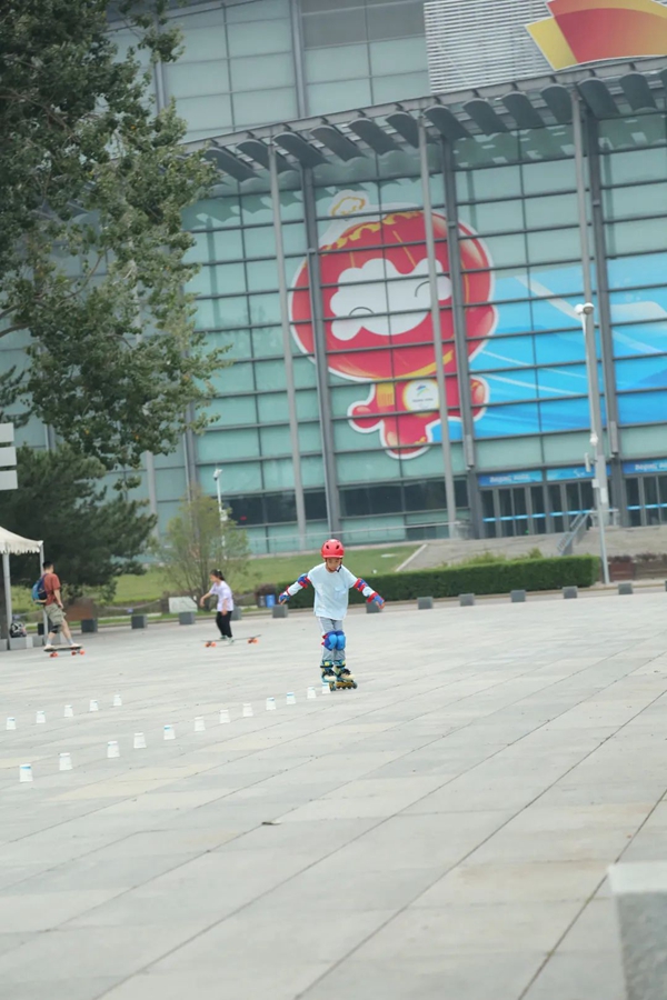 “有雪容融给我加油,今天一定会有进步!”——在国家体育场大门前练习轮滑的小男孩。