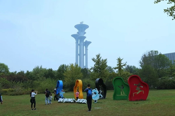 “我和冰墩墩同框啦!”——公园里和北京2022冬奥标识合影的小朋友们。