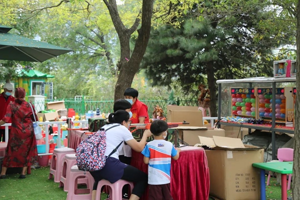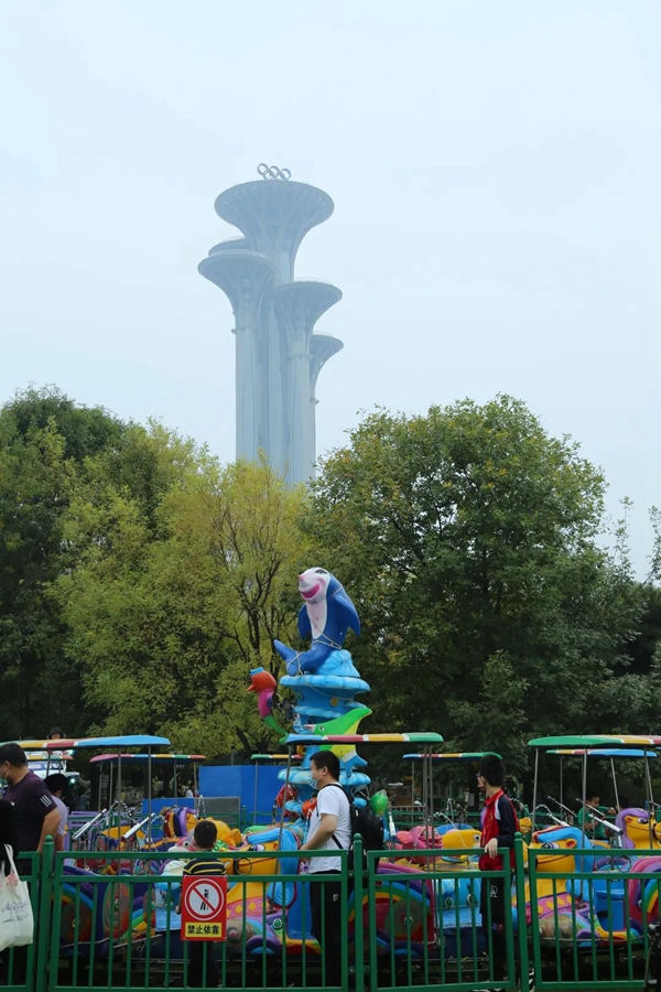 在奥森公园儿童游乐区,小朋友正在排队游玩。