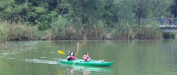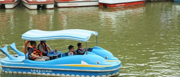 小朋友在公园体验水上项目,坐在皮划艇、小船上,怡然自得。
