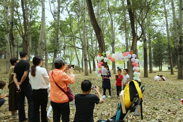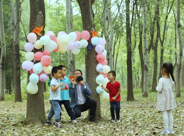 林间的一场家庭聚会,小朋友们在表演精心准备的诗歌朗诵。
