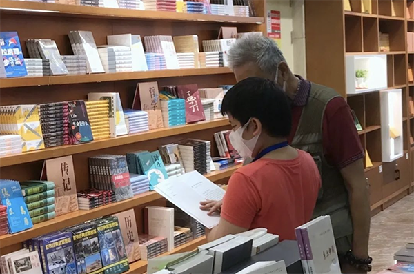 在丰富的党史读物书柜前认真翻阅。