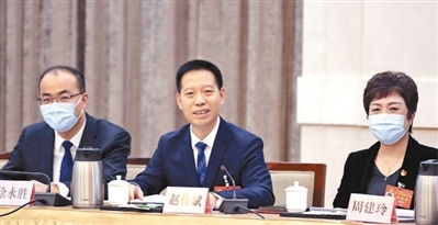 陕西代表团举行全体会议,代表们热议党的二十大报告。图为渭南市委常委、富平县委书记赵林斌代表(中)在发言。母家亮 程龙摄影报道