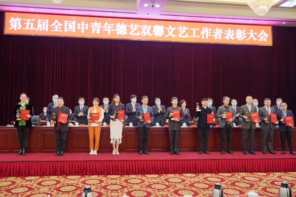 3月28日,由中宣部、人力资源社会保障部、中国文联主办的第五届全国中青年德艺双馨文艺工作者表彰大会在京隆重召开。图为大会现场。