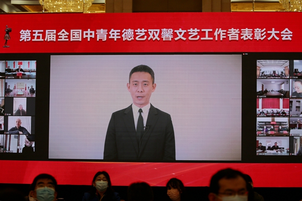 3月28日,由中宣部、人力资源社会保障部、中国文联主办的第五届全国中青年德艺双馨文艺工作者表彰大会在京隆重召开。图为受表彰的德艺双馨文艺工作者代表张译在线上作大会交流发言。