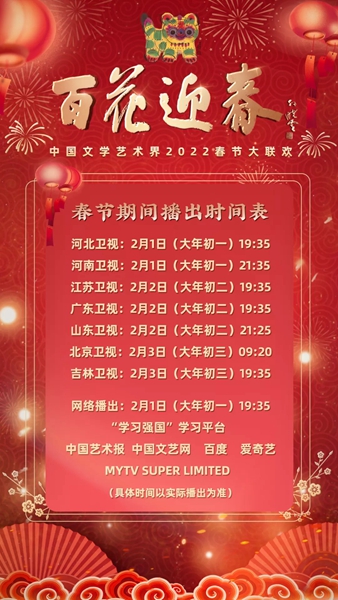 2月1日(正月初一)起,“百花迎春——中国文学艺术界2022春节大联欢”将在河北卫视、河南卫视、山东卫视、江苏卫视、广东卫视、吉林卫视、北京卫视陆续播出,并在“学习强国”学习平台、中国艺术报、中国文艺网、百度、爱奇艺、MyTV Super Limited等网络平台上线。