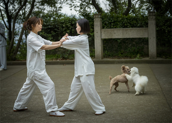 2021年5月3日,在浙江省温岭市泽国镇小广场上,晨练的人们在练习太极拳,小狗在一旁学得惟妙惟肖。梁丹斌 摄