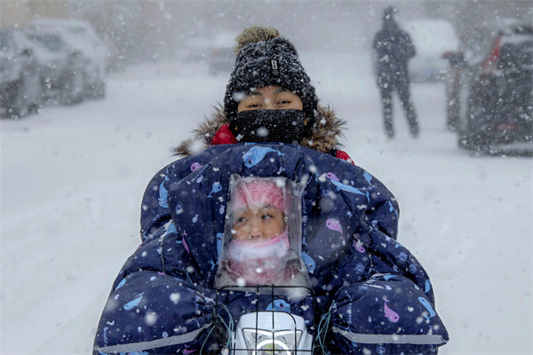 2020年2月2日,在内蒙古赤峰市,一位妇女带着孩子冒雪骑行在街道上。赵志强 摄