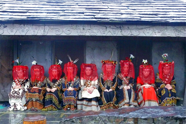 2022年7月22日,台湾鲁凯族群参加婚礼的新娘在屋檐下躲雨。林再生 摄
