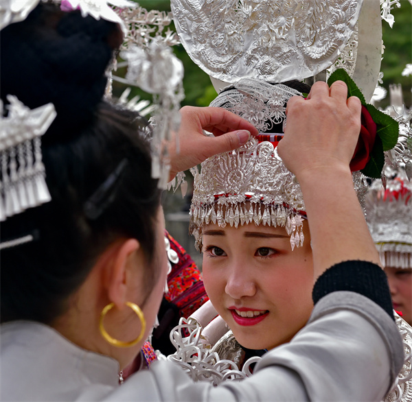 2017年4月,在贵州台江施洞姊妹节上,一位苗族妇女为女儿整理盛装。陈炳忠 摄