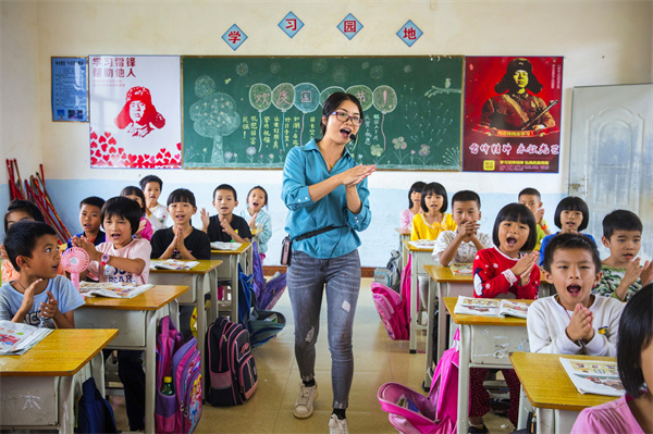 2020年10月10日, 在广东省肇庆市怀集县冷坑镇朗照村朗照小学修缮后的教室里,女教师为学生们上英语课。从2019 年5 月开始,朗照村利用帮扶单位资金30余万元修缮中心小学朗照教学点的教学楼。该校还设立资助金,用于奖励优秀学子和帮助困难学生就学。张鉴来 摄
