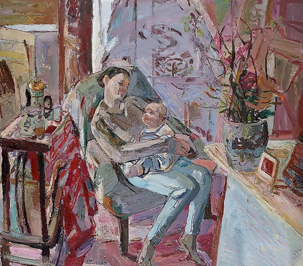 在女性艺术家中闫平的绘画,不仅描绘了日常生活,而且还表达了艺术家的情感以及生活态度。《母与子》作为其绘画作品中非常具有代表性的一个类别能为人所称赞,与其女性的独特视角有关。我们能发现无论是母亲怀抱孩子、与孩子对视或者二人之间的肢体触碰,闫平总能通过构图与动态的塑造来将二人“联系”在一起,这种联系不是生硬