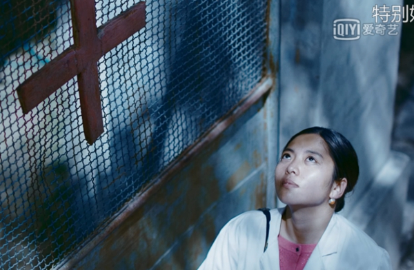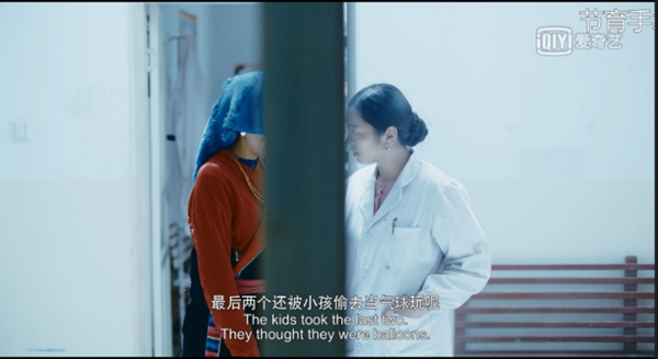 卓嘎是一个充满矛盾的角色,她内心的纠结真实地反映了人性的复杂。日常行为上,她传统、保守,不让男医生瞧病,与周措大夫谈及避孕等隐私问题时要避开周围人。周措大夫代表进步的现代女性,也是卓嘎的启蒙者,她白衣天使的身份明确带有拯救的意味。片中卓嘎与周措有过两次对话,第一次,卓嘎找周措商量做结扎手术的事情:镜头以旁观者的角度从对向拍摄。画面由中间的铁窗框分割成对称的两部分,左边一半没有遮挡,可见身着传统服饰的卓嘎、开着房门的诊室和白墙,右边一半的视野隔着玻璃,可见身穿白大褂的周措、一把长椅和白墙。画面构图与色彩搭配协调讲究,给人强烈的平衡感。卓嘎与周措交好,虽同处一个时代,观念上却如画面一般被分割在两个世界。与之比类,人的思想发展是不平衡的,要改变固有观念和习俗,特别是质疑根深蒂固的宗教信仰并不容易,往往迫于现实处境的无奈而被动引起。就像卓嘎,如果没有避孕套事件和爷爷意外去世,她几乎不会思考生命的意义与信仰的真谛。在片尾的超现实画面里,各角色逐一望向高空的气球,其中俯拍周措的镜头,她处于右下,十字架处于左上,自然形成对角线分割,画面对称平衡,凸显出角色身份所“比兴”的精神救赎之意。