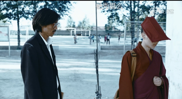 片中,卓玛以尼姑的身份出现,在江洋的中学偶遇旧日恋人德本加,二人的对话画面由一根天线自然分割,一俗一僧置于两界。关于他们的情感纠葛影片并没有明确笔墨,只给出大量暗示信息,例如,他们之间简单的对话以及见面时卓玛躲闪和心神不宁的举止,隐含两人之间有过情感纠葛,卓玛的出家也与之相关;卓玛和江洋离开学校前德本加送给卓玛的一本名为《气球》的书,卓玛几次翻看,却无奈被姐姐卓嘎烧毁,使人联想书中记述的是两人的情感故事;卓嘎得知自己怀孕,找卓玛商量,卓玛劝诫姐姐千万不能犯下自己曾经犯过的错,暗含她曾经怀过孕、打过胎,如此,等等。这种浅藏辄止的隐匿式表达体现了中国美学追求含蓄蕴藉,令观者含味无尽。与卓嘎一样,卓玛的内心也充满矛盾,一方面出家人的身份代表她出离世间、舍弃尘缘的向往,而另一方面,她的举动表明,自己依然无法走出红尘,在信仰里寻得宁静。影片中段,德本加来江洋家找卓玛,希望澄清过往的误会,但卓嘎谎称卓玛已回寺院并欲归还《气球》。二人的对话场景同样采取对称分割的平衡构图。卓嘎与德本加对卓玛持有不同的爱,他们之间的矛盾对立在于卓玛过往的情感经历给其带来的伤害与出家的事实。这条影片副线为卓嘎随后在现实中遭遇的困境埋下伏笔,前后照应,引发观者思考“爱”的深意。