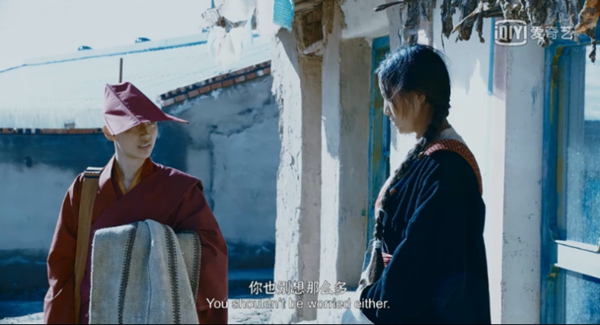影片有效运用俯拍、双人镜头、反射镜头、特写等技巧生动展现了人物情绪与关系,尤其多处运用移焦镜头,使同一画框内的两个人一实一虚地交替再现,通过导引观众的注意力强化人物之间的矛盾冲突,引发观者思忖藏区女性自我意识觉醒的艰阻。