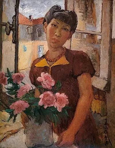 然而,1945 年间潘玉良创作的《红衣自画像》(图五)中,时髦的法式洋裙穿着,手持瓶花倚窗,目光沉着坚定,甚至带着一丝冷峻,当时的她当选为中国留法艺术学会会长,同时获法国国家金奖,生活如鱼得水。获得外界肯定的她,对己身充满自信,将自己的现实状态如实地应在画面上。