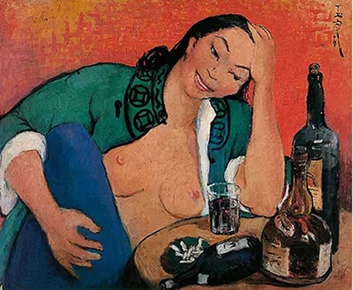 1963年《半裸的自画像》(图十),为她留予人世唯一有笑容的一幅自画像。赤红的背景中独自饮酒,烟灰缸中多的是燃烧殆尽的烟头,桌上两只洋酒和一放倒空瓶,暗示着她已入酣醉,她自在豪放地敞开衣襟露出乳房,不顾形象地抬腿安放使身体达到最放松的状态。也许是酒精的催化,她用一只手撑住眩晕的头,这是她对自己最狂放不羁的一次描写。在古今中西画作里,我们能找到许多以男性饮酒为画面的作品,大多数人们除感受画面慷慨激昂之余,对画面持正面性赞同,将其视为常理。但如果图像换成女性袒胸露乳的豪饮,或许到现今社会的大众仍所不能容。这源于社会对男性和女性根本的看待不同,这种不同长久下来形成了一种社会给予女性的压力与束缚。潘玉良后期的自画像,打破社会对女人既定的眼光,对作为独立女性的自我认同度越来越高,我们更多看到的是作为一个纯粹女性的自己,这即是女性主义中所追求的精神上的自由。她终于摆脱了男性艺术秩序和审美体系里符号化的女性形象,获得了独立存在的意义。