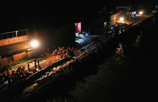 2021年汾河新绛县段抗洪救灾一线记录——2021年10月7日凌晨,天龙救援队和新绛县龙兴镇桥东村群众一同抢险。运城市 金玉敏 摄