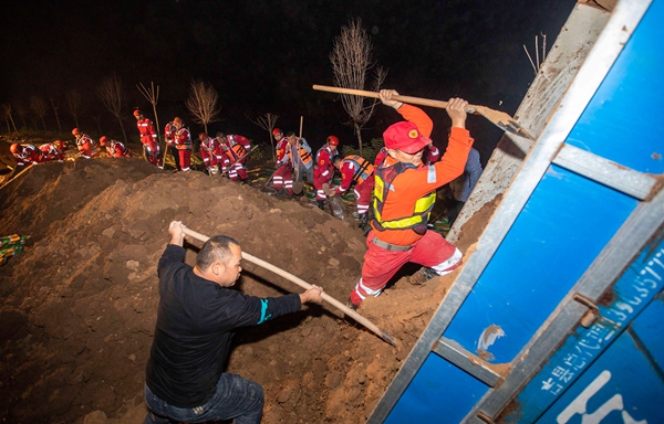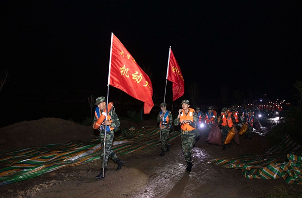 2021年汾河新绛县段抗洪救灾一线记录——2021年10月7日凌晨,武警战士赶到新绛县龙兴镇桥东村,加入到紧张的防汛抢险队伍中。运城市 金玉敏 摄