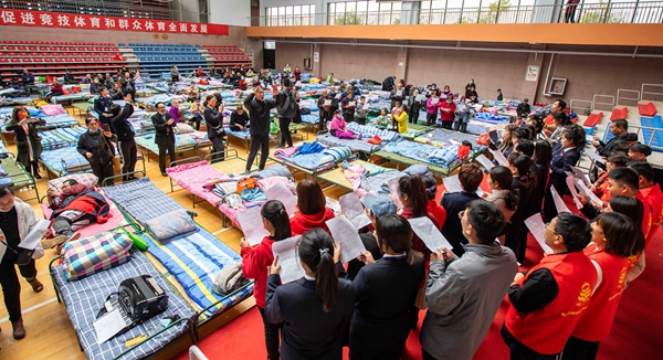 2021年汾河新绛县段抗洪救灾一线记录——2021年10月10日,志愿者团队在新绛县体育馆临时安置点表演大合唱,缓解安置点群众的压力。运城市 金玉敏 摄