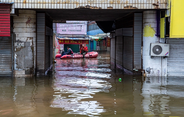 2021年汾河新绛县段抗洪救灾一线记录——2021年10月9日,天龙救援队队员在一市场内排查是否有尚未转移的群众。运城市 金玉敏 摄
