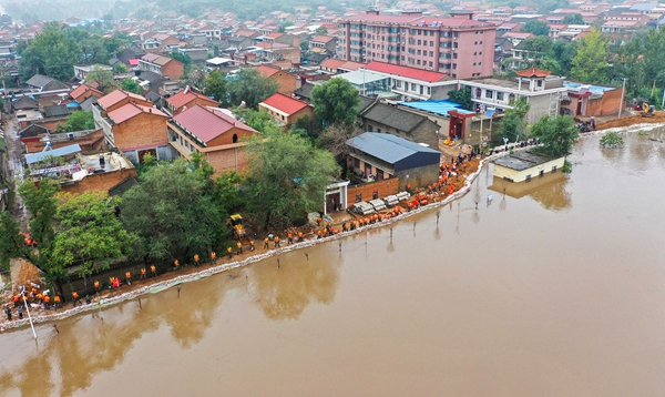 2021年汾河新绛县段抗洪救灾一线记录——2021年10月7日早7时,桥东村河堤上的抢险人员奋战一夜,用沙袋把洪水挡在了河道里,此时河水已经高出原河堤1米左右。运城市 金玉敏 摄