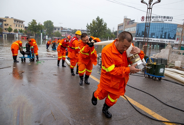 2021年汾河新绛县段抗洪救灾一线记录——2021年10月9日,国家矿山应急救援大同队的队员在调整抽水设备。当日来了8支专业救援队。运城市 金玉敏 摄