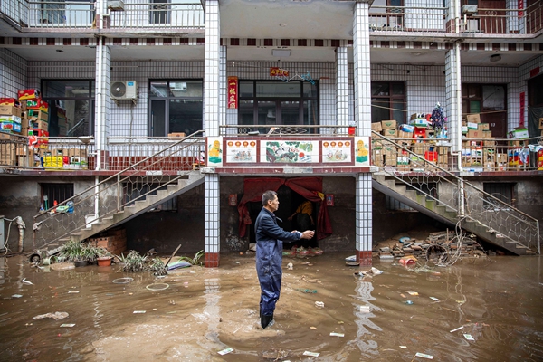 2021年汾河新绛县段抗洪救灾一线记录——2021年10月12日,一位卖种子的商家站在仓库前(一楼红色门帘里面是他的仓库)。运城市 金玉敏 摄