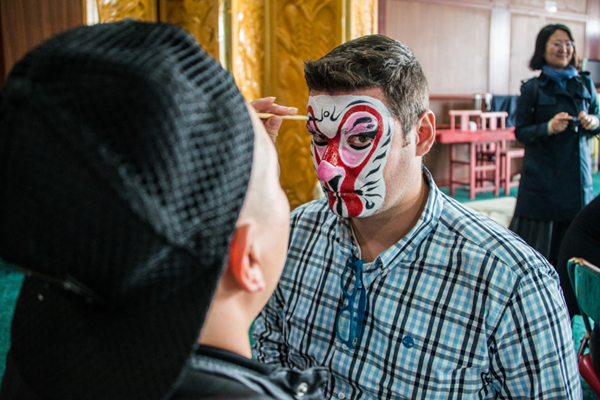 外国友人体验中国戏曲化妆。